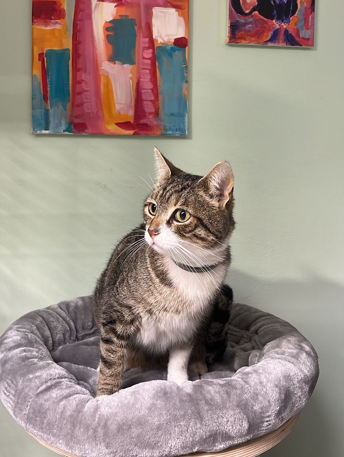 U prostoriji je uključen Feliway koji umanjuje stres kod maca. Hrana je Gourmet mouse ili neka druga po želji vlasnika ili potrebama mace, a pijesak Green cat koji koristimo je u potpunosti prirodan i izraden iz 100 posto prirodnog materijala.